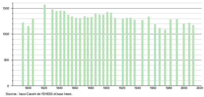 - ↑ Dans le tableau des recensements et le graphique, par convention dans Wikipédia, le principe a été retenu, pour les populations légales postérieures à 1999 de n’afficher dans le tableau des recensements et le graphique que les populations correspondant à l'année 2006, première population légale publiée calculée conformément aux concepts définis dans le décret no 2003-485 du 5 juin 2003, et les années correspondant à une enquête exhaustive de recensement pour les communes de moins de 10 000 habitants, ainsi que la dernière population légale publiée par l’Insee.
