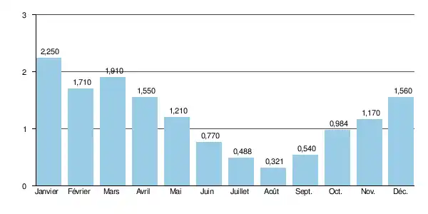 Aux étiages, le VCN3 peut chuter jusque 0,063 m3/s (63 litres/s), en cas de période quinquennale sèche.