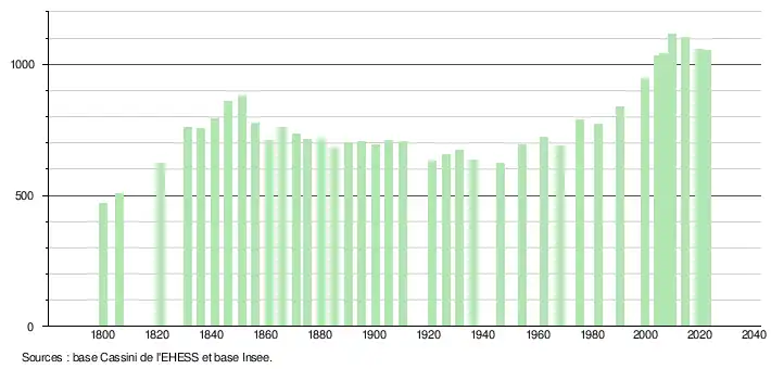 L'évolution du nombre d'habitants est connue à travers les recensements de la population effectués dans la commune depuis 1800. Pour les communes de moins de 10 000 habitants, une enquête de recensement portant sur toute la population est réalisée tous les cinq ans, les populations de référence des années intermédiaires étant quant à elles estimées par interpolation ou extrapolation[24]. Pour la commune, le premier recensement exhaustif entrant dans le cadre du nouveau dispositif a été réalisé en 2004[25].