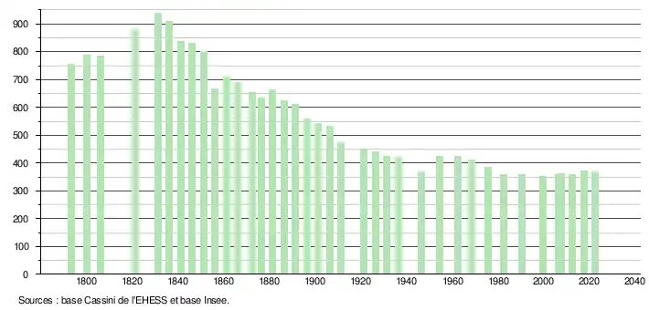 L'évolution du nombre d'habitants est connue à travers les recensements de la population effectués dans la commune depuis 1793. Pour les communes de moins de 10 000 habitants, une enquête de recensement portant sur toute la population est réalisée tous les cinq ans, les populations de référence des années intermédiaires étant quant à elles estimées par interpolation ou extrapolation[24]. Pour la commune, le premier recensement exhaustif entrant dans le cadre du nouveau dispositif a été réalisé en 2007[25].