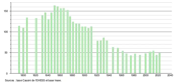 L'évolution du nombre d'habitants est connue à travers les recensements de la population effectués dans la commune depuis 1793. Pour les communes de moins de 10 000 habitants, une enquête de recensement portant sur toute la population est réalisée tous les cinq ans, les populations de référence des années intermédiaires étant quant à elles estimées par interpolation ou extrapolation[17]. Pour la commune, le premier recensement exhaustif entrant dans le cadre du nouveau dispositif a été réalisé en 2007[18].