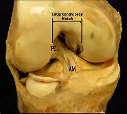 Les facteurs anatomiques sont soupçonnés déjà depuis longtemps. La résistance à la rupture d'un LC dépend directement de sa largeur, qui varie d'un individu à l'autre. Dans une étude anthropométrique, les LCA du genou controlatéral intact de patients victimes d'une rupture de LCA ont été comparés avec ceux d'individus de même poids corporel. Les volumes des LC ont été déterminés par IRM. Dans le groupe des blessés, le volume des LCA contralatéraux était en moyenne 1 921 mm3, tandis que dans le groupe de contrôle, il était de 2 151 mm3. Les auteurs de l'étude en concluent que les différences anthropométriques des volumes – et de la largeur qu'on en déduit – des LC ont une influence directe sur la probabilité d'une rupture de LC sans agression externe[49]. Déjà dans des études précédentes, on a établi une corrélation entre cavité ligamentaire du fémur (notch intercondylaire : voir figure) étroite, liée à des ligaments plus étroits, et un risque plus élevé de rupture de LC[50],[51],[52],[53],[54],[55]. Cependant on n'est pas arrivé à un consensus scientifique, parce que d'autres études aboutissent à des résultats opposés[43],[56],[57]. Par rapport aux hommes, les femmes ont une cavité ligamentaire plus étroite, ce qui pourrait expliquer une incidence plus élevée des ruptures de LC chez les femmes[58],[59].