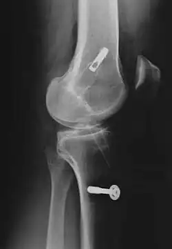 - ↑ (en) A. J. Hart et al., « Assessment of osteoarthritis after reconstruction of the anterior cruciate ligament: a study using single-photon emission computed tomography at ten years. », J Bone Joint Surg Br, vol. 87, , p. 1483–1487 (PMID 16260663)