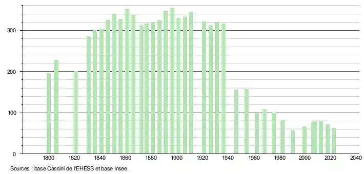L'évolution du nombre d'habitants est connue à travers les recensements de la population effectués dans la commune depuis 1800. Pour les communes de moins de 10 000 habitants, une enquête de recensement portant sur toute la population est réalisée tous les cinq ans, les populations de référence des années intermédiaires étant quant à elles estimées par interpolation ou extrapolation[15]. Pour la commune, le premier recensement exhaustif entrant dans le cadre du nouveau dispositif a été réalisé en 2007[16].