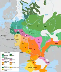 - Séparation de la langue slave orientale (vieux russe) du proto-slave et évolution en trois langues distinctes (biélorusse, russe, ukrainien) (du VIe – VIIe siècle au XIVe siècle).
