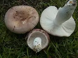 - Russula vesca f. neglecta (Singer), au chapeau bleu-grisâtre crème[12].
