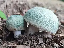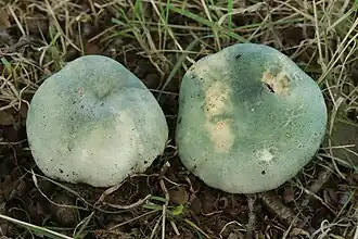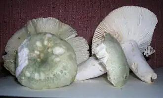 - La Russule vert-de-gris (Russula aeruginea), qui n'est pas craquelée et qui est plutôt gris-vert ou vert olive.