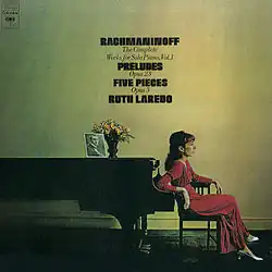 De 1974 à 1981, suivent l'intégrale des œuvres pour piano de Rachmaninov, occupant sept disques, pour CBS Masterworks (réédité en 1993 par Sony Classical sur cinq CD), un projet qu'aucun pianiste n'avait osé entreprendre auparevant (à la même époque, le pianiste germano-américain Michael Ponti, a également enregistré Scriabine et Rachmaninov respectivement pour CBS et Vox Records). À cette époque, Ruth Laredo était l'une des rares pianistes solistes, en particulier elle interprétait les œuvres de Rachmaninov alliant exigences techniques et musculaires[réf. nécessaire]. elles n'étaient que quelques-unes, par exemple, Gina Bachauer, Myra Hess et, plus tard, Alicia de Larrocha. C'est le New York Daily News qui l'a baptisée « la première dame du piano de l'Amérique », surnom repris par bien d'autres ensuite. Au départ Laredo n'aimait pas l'expression qu'elle sentait sexiste : elle voulait être connu en tant que pianiste et non comme une « femme pianiste »[25], mais plus tard, elle a cédé et a utilisé elle-même le titre dans son livre et sur son site Web.