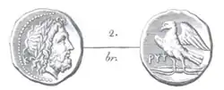 Monnaie de Ruvo di Puglia. Côté face, on retrouve l'inscription ΡΥΨ, le nom de la ville.