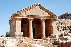 Une tombe en forme de temple, entièrement conservée, est datée par une inscription de 384/385. L'inscription, visible sur le fronton nord, donne les noms des personnes enterrées comme Bassimas et Mathbabée [8],[9]. Un autre tombeau-temple est situé au nord, en dehors de la ville.