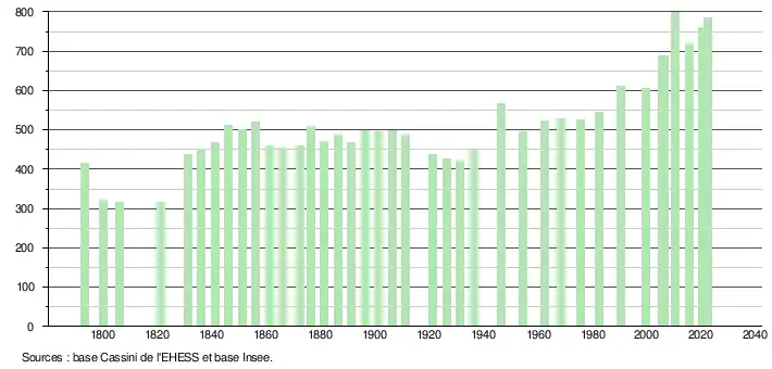 L'évolution du nombre d'habitants est connue à travers les recensements de la population effectués dans la commune depuis 1793. Pour les communes de moins de 10 000 habitants, une enquête de recensement portant sur toute la population est réalisée tous les cinq ans, les populations de référence des années intermédiaires étant quant à elles estimées par interpolation ou extrapolation[22]. Pour la commune, le premier recensement exhaustif entrant dans le cadre du nouveau dispositif a été réalisé en 2005[23].