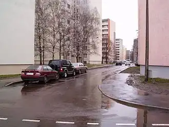 Le quartier (en rouge) dans son arrondissement (en orange) et dans Tallinn (en jaune)