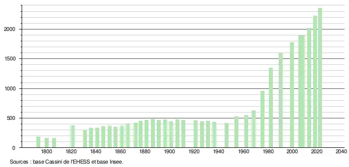 L'évolution du nombre d'habitants est connue à travers les recensements de la population effectués dans la commune depuis 1793. Pour les communes de moins de 10 000 habitants, une enquête de recensement portant sur toute la population est réalisée tous les cinq ans, les populations de référence des années intermédiaires étant quant à elles estimées par interpolation ou extrapolation[33]. Pour la commune, le premier recensement exhaustif entrant dans le cadre du nouveau dispositif a été réalisé en 2008[34].