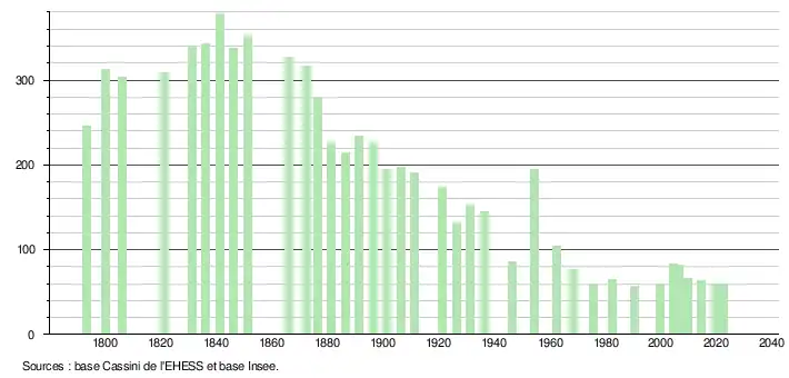 L'évolution du nombre d'habitants est connue à travers les recensements de la population effectués dans la commune depuis 1793. Pour les communes de moins de 10 000 habitants, une enquête de recensement portant sur toute la population est réalisée tous les cinq ans, les populations de référence des années intermédiaires étant quant à elles estimées par interpolation ou extrapolation[22]. Pour la commune, le premier recensement exhaustif entrant dans le cadre du nouveau dispositif a été réalisé en 2004[23].