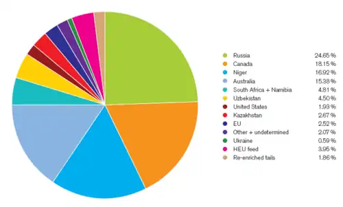 L'uranium pour l'énergie nucléaire est extrait et enrichi dans des pays divers et « stables ». Il s'agit notamment du Canada (23 % du total mondial en 2007), de l'Australie (21 %), du Kazakhstan (16 %) et de plus de 10 autres pays. L'uranium est extrait et le carburant est fabriqué bien avant les besoins. Le combustible nucléaire est considéré par certains comme une source d'énergie relativement fiable, étant plus répandu dans la croûte terrestre que l'étain, le mercure ou l'argent, bien qu'il existe un débat sur le moment d'un pic de l'uranium[21].