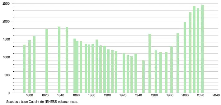 L'évolution du nombre d'habitants est connue à travers les recensements de la population effectués dans la commune depuis 1793. Pour les communes de moins de 10 000 habitants, une enquête de recensement portant sur toute la population est réalisée tous les cinq ans, les populations de référence des années intermédiaires étant quant à elles estimées par interpolation ou extrapolation[23]. Pour la commune, le premier recensement exhaustif entrant dans le cadre du nouveau dispositif a été réalisé en 2006[24].