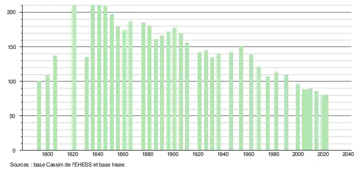 | L'évolution du nombre d'habitants est connue à travers les recensements de la population effectués dans la commune depuis 1793. Pour les communes de moins de 10 000 habitants, une enquête de recensement portant sur toute la population est réalisée tous les cinq ans, les populations de référence des années intermédiaires étant quant à elles estimées par interpolation ou extrapolation[28]. Pour la commune, le premier recensement exhaustif entrant dans le cadre du nouveau dispositif a été réalisé en 2004[29]. En 2022, la commune comptait 81 habitants[Note 3], en évolution de −1,22 % par rapport à 2016 (Hautes-Pyrénées : +1,59 %, France hors Mayotte : +2,11 %). |