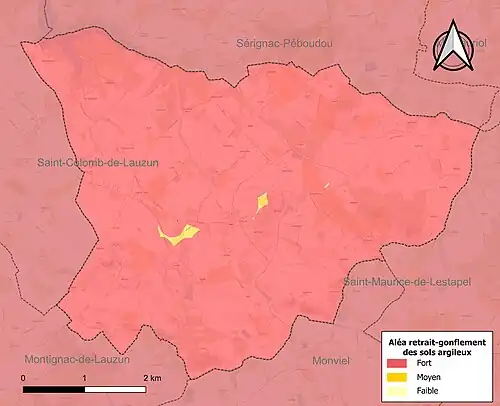 Le retrait-gonflement des sols argileux est susceptible d'engendrer des dommages importants aux bâtiments en cas d’alternance de périodes de sécheresse et de pluie[19]. La totalité de la commune est en aléa moyen ou fort (91,8 % au niveau départemental et 48,5 % au niveau national)[Carte 2]. Depuis le , en application de la loi ELAN, différentes contraintes s'imposent aux vendeurs, maîtres d'ouvrages ou constructeurs de biens situés dans une zone classée en aléa moyen ou fort[Note 2],[20].