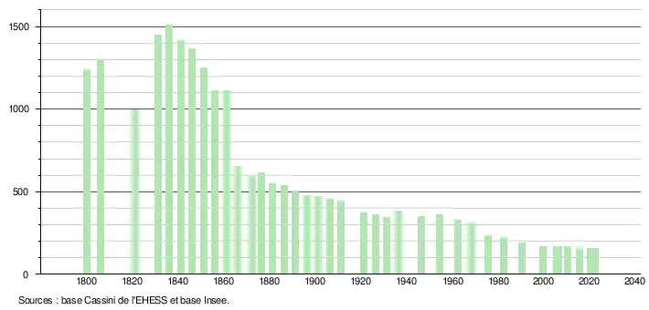 L'évolution du nombre d'habitants est connue à travers les recensements de la population effectués dans la commune depuis 1800. Pour les communes de moins de 10 000 habitants, une enquête de recensement portant sur toute la population est réalisée tous les cinq ans, les populations de référence des années intermédiaires étant quant à elles estimées par interpolation ou extrapolation[21]. Pour la commune, le premier recensement exhaustif entrant dans le cadre du nouveau dispositif a été réalisé en 2005[22].