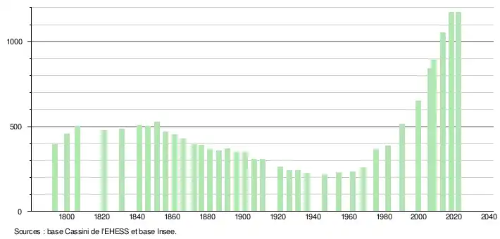 L'évolution du nombre d'habitants est connue à travers les recensements de la population effectués dans la commune depuis 1793. Pour les communes de moins de 10 000 habitants, une enquête de recensement portant sur toute la population est réalisée tous les cinq ans, les populations de référence des années intermédiaires étant quant à elles estimées par interpolation ou extrapolation[23]. Pour la commune, le premier recensement exhaustif entrant dans le cadre du nouveau dispositif a été réalisé en 2008[24].