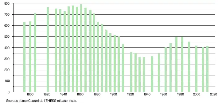 - ↑ Dans le tableau des recensements et le graphique, par convention dans Wikipédia, le principe a été retenu, pour les populations légales postérieures à 1999 de n’afficher dans le tableau des recensements et le graphique que les populations correspondant à l'année 2006, première population légale publiée calculée conformément aux concepts définis dans le décret no 2003-485 du 5 juin 2003, et les années correspondant à une enquête exhaustive de recensement pour les communes de moins de 10 000 habitants, ainsi que la dernière population légale publiée par l’Insee.
