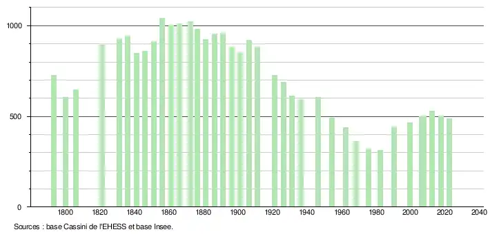 L'évolution du nombre d'habitants est connue à travers les recensements de la population effectués dans la commune depuis 1793. Pour les communes de moins de 10 000 habitants, une enquête de recensement portant sur toute la population est réalisée tous les cinq ans, les populations de référence des années intermédiaires étant quant à elles estimées par interpolation ou extrapolation[36]. Pour la commune, le premier recensement exhaustif entrant dans le cadre du nouveau dispositif a été réalisé en 2007[37].