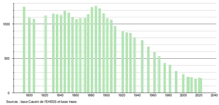 L'évolution du nombre d'habitants est connue à travers les recensements de la population effectués dans la commune depuis 1793. Pour les communes de moins de 10 000 habitants, une enquête de recensement portant sur toute la population est réalisée tous les cinq ans, les populations de référence des années intermédiaires étant quant à elles estimées par interpolation ou extrapolation[13]. Pour la commune, le premier recensement exhaustif entrant dans le cadre du nouveau dispositif a été réalisé en 2005[14].