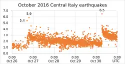 | 26 oct 2016 19:10:36 | 5,4 | 9 km | Castelsantangelo sul Nera | 42,88 N | 13,13 E |