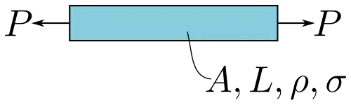 Dans la première situation, le faisceau subit deux forces: le poids de la gravité et tension . Les variables du matériau sont la masse volumique et force . Supposons que la longueur et tension sont fixes, ce qui en fait des variables de conception. Enfin l'aire de la section transversale est une variable libre. L'objectif dans cette situation est de minimiser le poids en choisissant un matériau avec la meilleure combinaison de variables de matériau . La figure 1 illustre ce chargement.