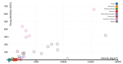 Le premier diagramme à droite montre la masse volumique et le module d'Young, sur une échelle linéaire. Le deuxième diagramme montre les mêmes attributs de matériaux sur une échelle log-log. Les familles de matériaux (polymères, mousses, métaux, etc.) sont identifiées par des couleurs.