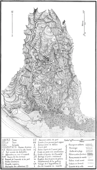 En redescendant, Chapot avait du mal à suivre le tracé de l’enceinte, se plaignant que les habitants aient réutilisés des pans entiers pour la construction de leurs habitations, notant par la même que des descriptions antérieures aient fait mention de — beaucoup — plus de restes. À certains étroits, l’enceinte aurait été taillée dans la roche même, profitant de la topographie pour défendre la cité. Un ancien torrent, celui même dont il sera question lors de la description du tunnel, interrompt l’enceinte — preuve que celle-ci est antérieure à la construction du même tunnel sous les flaviens ? Chapot croit avoir trouvé le passage de la ville haute à la ville basse en décrivant une voie taillée de main d’homme Polybe utilise la même expression, mais elle prend peut-être un autre sens: On ne peut y accéder, du côté de la mer, que par une seule voie, une rampe taillée à main d’homme, qui ne cesse de tourner, formant ainsi d’innombrables lacets.] et estime que les ouvrages en P et R servaient à fortifier ce sentier fort sinueux. Non loin de l’ancien bassin du port Chapot note « un vaste ensemble de décombres » duquel on aurait « une grande quantité de débris d’œuvres d’art: des statues, des bas-reliefs et des colonnes de grande dimension », auquel il est tenté d’associer la classique rue à colonnades à la syrienne.