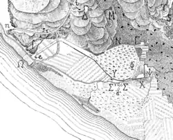 « Deux tours servaient probablement à défendre le port. Il y en avait une autre au midi, taillée sur le roc, au bas duquel était un souterrain de vingt-quatre pieds de long sur dix de large. La commençait un môle d’environ soixante-sept pas de long sur dix-huit de large, bâti de grosses pierres (...) qui étaient liées avec des crampons de fer. Il y a tout lieu de croire que les vaisseaux mouillaient entre deux pendant l’été et que l’on les remorquait dans le bassin à l’arrivée de l’hiver. » « On exécuta l’ouvrage extraordinaire dont parle Polybe pour établir une communication entre la ville et la mer; il dit qu’il était taillé dans le rocher en forme d’escalier. (...) il aboutissait à la mer. »