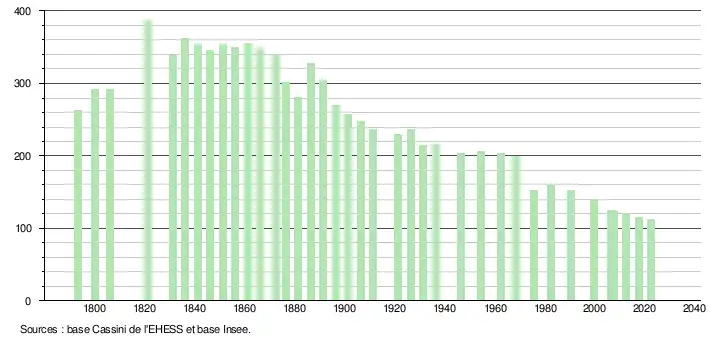 L'évolution du nombre d'habitants est connue à travers les recensements de la population effectués dans la commune depuis 1793. Pour les communes de moins de 10 000 habitants, une enquête de recensement portant sur toute la population est réalisée tous les cinq ans, les populations de référence des années intermédiaires étant quant à elles estimées par interpolation ou extrapolation[27]. Pour la commune, le premier recensement exhaustif entrant dans le cadre du nouveau dispositif a été réalisé en 2007[28].