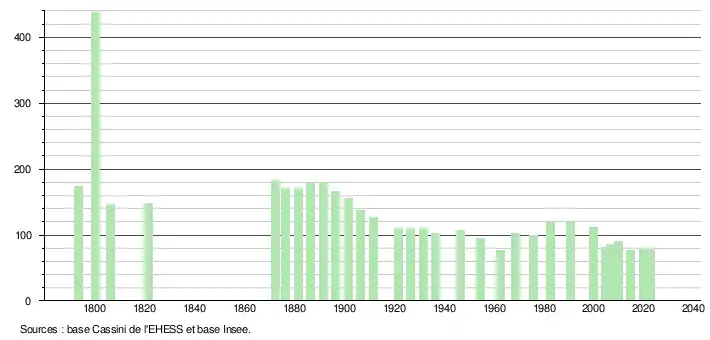 L'évolution du nombre d'habitants est connue à travers les recensements de la population effectués dans la commune depuis 1793. Pour les communes de moins de 10 000 habitants, une enquête de recensement portant sur toute la population est réalisée tous les cinq ans, les populations de référence des années intermédiaires étant quant à elles estimées par interpolation ou extrapolation[14]. Pour la commune, le premier recensement exhaustif entrant dans le cadre du nouveau dispositif a été réalisé en 2004[15].