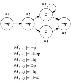 De manière informelle, la formule de la logique modale est définie comme étant vraie dans un monde w si et seulement si est vraie dans tous les mondes accessibles depuis w. La formule est vraie dans un monde w si et seulement s'il existe un monde w' accessible depuis w tel que soit vraie dans le monde w' .
