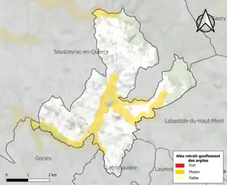 Le retrait-gonflement des sols argileux est susceptible d'engendrer des dommages importants aux bâtiments en cas d’alternance de périodes de sécheresse et de pluie. 19 % de la superficie communale est en aléa moyen ou fort (67,7 % au niveau départemental et 48,5 % au niveau national). Sur les 106 bâtiments dénombrés sur la commune en 2019, 13 sont en aléa moyen ou fort, soit 12 %, à comparer aux 72 % au niveau départemental et 54 % au niveau national. Une cartographie de l'exposition du territoire national au retrait gonflement des sols argileux est disponible sur le site du BRGM[19],[Carte 2].