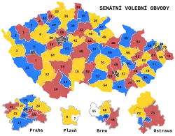 Le Sénat est composé de 81 sièges renouvelés par tiers tous les deux ans, les sénateurs étant élus pour un mandat de six ans au scrutin uninominal majoritaire à deux tours. Les candidats, âgés d'au minimum quarante ans, de nationalité tchèque et disposant de leurs droits civiques doivent réunir la majorité absolue au premier tour ou, à défaut, arriver en tête lors d'un second tour organisé six jours plus tard entre les deux candidats arrivés en tête au premier. La fonction de sénateur est incompatible avec celle de président de la République, de député, de chef d'un exécutif local, ainsi qu'avec les fonctions de juge, de procureur et de médiateur[1].