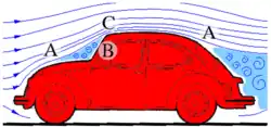 Au culot de la voiture, se produit un autre décollement (ou séparation de la couche limite), au point (A) de droite. Ce décollement classique est nommé décollement de culot ou zone d'eau morte[n 1].