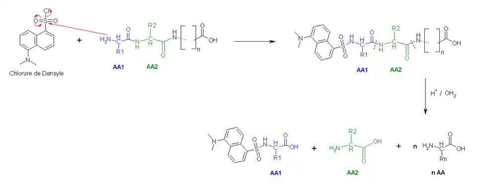 - La deuxième méthode utilise le chlorure de dansyle, qui, combiné à une hydrolyse totale acide forme un Dansyl-AcideAminé1 (DNS-aa) qui est fluorescent et un hydrolysat.