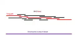 Bien que les séquences complètes des contigs BAC ne soient pas connues, on connaît en revanche leurs orientations les unes par rapport aux autres. Il existe plusieurs méthodes pour déduire cet ordre et sélectionner les BAC qui composent un chemin de tuiles. La stratégie générale consiste à identifier les positions des clones les uns par rapport aux autres, puis à sélectionner le moins de clones possible requis pour former un échafaudage contigu couvrant toute la zone d'intérêt. L'ordre des clones est déduit en déterminant la manière dont ils se chevauchent[15]. Les clones qui se chevauchent peuvent être identifiés de plusieurs façons. Une petite sonde radioactivement ou chimiquement marquée contenant un site à séquence marquée (STS) peut être hybridée sur une micropuce sur laquelle les clones sont empreints. De cette façon, on peut identifier tous les clones qui contiennent une séquence particulière dans le génome. L'extrémité de l'un de ces clones peut ensuite être séquencée pour donner une nouvelle sonde et on répète le processus dans une méthode appelée arpentage chromosomique.