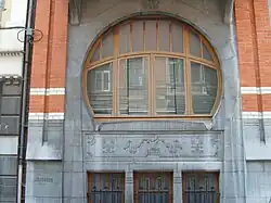 Au n° 11, la baie d'imposte forme un arc brisé et outrepassé surmonté d'une tête de femme sculptée et de deux sgraffites (abîmés) à motif floral.