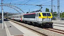 Arrivée à Bruxelles-Midi d'une 27 remorquant une rame de voitures M6.