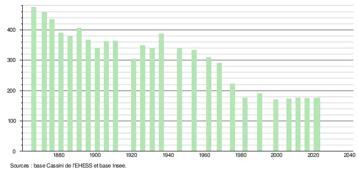 L'évolution du nombre d'habitants est connue à travers les recensements de la population effectués dans la commune depuis 1866. Pour les communes de moins de 10 000 habitants, une enquête de recensement portant sur toute la population est réalisée tous les cinq ans, les populations de référence des années intermédiaires étant quant à elles estimées par interpolation ou extrapolation[20]. Pour la commune, le premier recensement exhaustif entrant dans le cadre du nouveau dispositif a été réalisé en 2006[21].