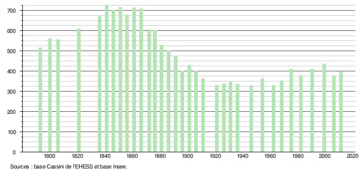 L'évolution du nombre d'habitants est connue à travers les recensements de la population effectués dans la commune depuis 1793. À partir du , les populations légales des communes sont publiées annuellement dans le cadre d'un recensement qui repose désormais sur une collecte d'information annuelle, concernant successivement tous les territoires communaux au cours d'une période de cinq ans. Pour les communes de moins de 10 000 habitants, une enquête de recensement portant sur toute la population est réalisée tous les cinq ans, les populations légales des années intermédiaires étant quant à elles estimées par interpolation ou extrapolation[10]. Pour la commune, le premier recensement exhaustif entrant dans le cadre du nouveau dispositif a été réalisé en 2006[11],[Note 2].