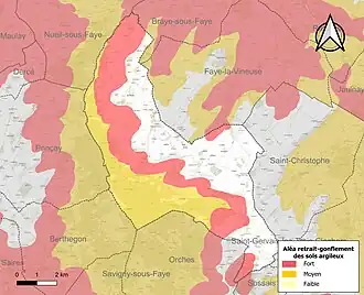 Les mouvements de terrains susceptibles de se produire sur la commune sont des affaissements et effondrements liés aux cavités souterraines (hors mines) et des tassements différentiels[17]. Afin de mieux appréhender le risque d’affaissement de terrain, un inventaire national permet de localiser les éventuelles cavités souterraines sur la commune[18]. Le retrait-gonflement des sols argileux est susceptible d'engendrer des dommages importants aux bâtiments en cas d’alternance de périodes de sécheresse et de pluie[19]. 57,9 % de la superficie communale est en aléa moyen ou fort (79,5 % au niveau départemental et 48,5 % au niveau national)[Carte 2]. Depuis le , en application de la loi ÉLAN, différentes contraintes s'imposent aux vendeurs, maîtres d'ouvrages ou constructeurs de biens situés dans une zone classée en aléa moyen ou fort[Note 1],[20].