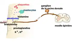 L'inflammation consécutive à une lésion tissulaire libère un grand nombre de médiateurs qui vont activer les terminaisons des fibres afférentes primaires (FAP) de type C et Aδ (dont les corps cellulaires sont situés dans les ganglions des racines dorsales) chargés de transmettre l'information nociceptive au cerveau par la voie spinothalamique. Les terminaisons de ces FAP nociceptives comportent une large panoplie de récepteurs et canaux[30]. Les fibres C déchargent lorsque de la sérotonine se lie aux récepteurs ionotropes 5-HT3 qu'elles expriment. Ces terminaisons comportent aussi des récepteurs couplés à une protéine G, comme les récepteurs sérotoninergiques 5-HT2A et aussi à un moindre degré 5-HT1A, et des récepteurs aux autres molécules algogènes comme la bradykinine, de l'histamine, etc.