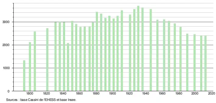 - ↑ Par convention dans Wikipédia, le principe a été retenu de n’afficher dans le tableau des recensements et le graphique, pour les populations légales postérieures à 1999, que les populations correspondant à une enquête exhaustive de recensement pour les communes de moins de 10 000 habitants, et que les populations des années 2006, 2011, 2016, etc. pour les communes de plus de 10 000 habitants, ainsi que la dernière population légale publiée par l’Insee pour l'ensemble des communes.