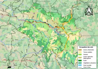 L'occupation des sols de la commune, telle qu'elle ressort de la base de données européenne d’occupation biophysique des sols Corine Land Cover (CLC), est marquée par l'importance des territoires agricoles (64,6 % en 2018), en augmentation par rapport à 1990 (63,1 %). La répartition détaillée en 2018 est la suivante : prairies (34,1 %), forêts (24,9 %), terres arables (17,2 %), zones agricoles hétérogènes (13,3 %), milieux à végétation arbustive et/ou herbacée (8,5 %), zones urbanisées (1,3 %), zones industrielles ou commerciales et réseaux de communication (0,7 %)[41].
