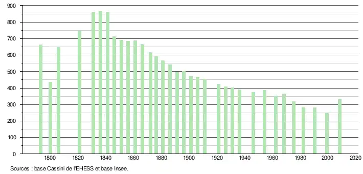- ↑ Par convention dans Wikipédia, le principe a été retenu de n’afficher dans le tableau des recensements et le graphique, pour les populations légales postérieures à 1999, que les populations correspondant à une enquête exhaustive de recensement pour les communes de moins de 10 000 habitants, et que les populations des années 2006, 2011, 2016, etc. pour les communes de plus de 10 000 habitants, ainsi que la dernière population légale publiée par l’Insee pour l'ensemble des communes.