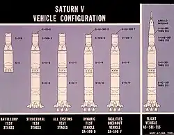 - S-IC-T : surnommé le « T-bird », il est utilisé pour les tests de poussée et d'utilisation des moteurs. Il est doté de moteurs réels ou factices en fonction des besoins de tests d'allumage et de poussée.